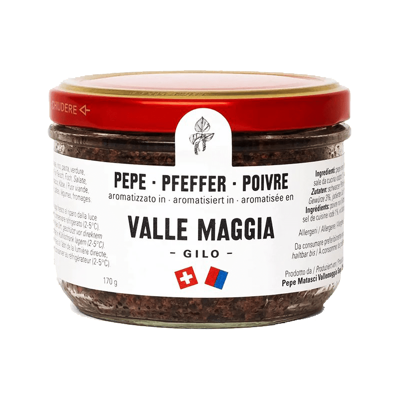 Zutaten: 96 % schwarzer Pfeffer aus Vietnam, 4 % Gewürze, Weißwein und Spirituosen. Eine einfache, aber außergewöhnliche Kombination, die die ganze Magie und Leidenschaft des Maggiatals in sich trägt.